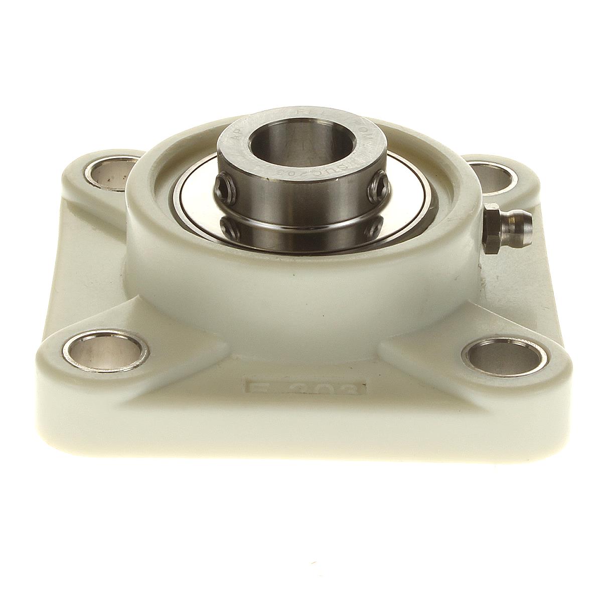 Technical informationFelstrom’s UCF203PSS is a white plastic housing unit with stainless steel insert bearing filled with food-safe Shell FM 22 bearing grease. Felstrom’s plastic housing units are fully filled with 100% white pure plastic preventing the ingress of dirt. These plastic housing units are often applied in the food and medical industries.